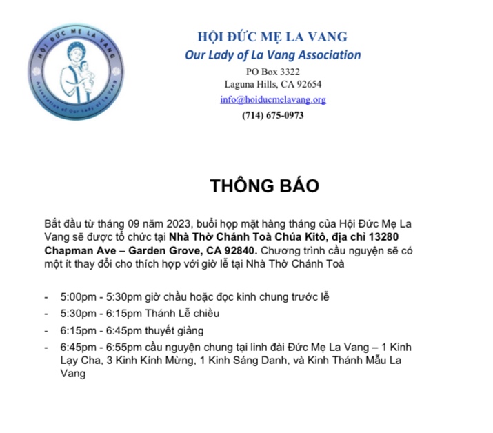 Kính mời Cộng Đoàn tham dự Thánh Lễ Đầu Tháng sẽ được cử hành vào lúc 9:00 sáng Thứ Bảy ngày 7 tháng 9 năm 2024 tại Linh Đài Đức Mẹ La Vang Nhà Thờ Chính Tòa Chúa Kitô 13280 Chapman Ave, Garden Grove, CA 92840.